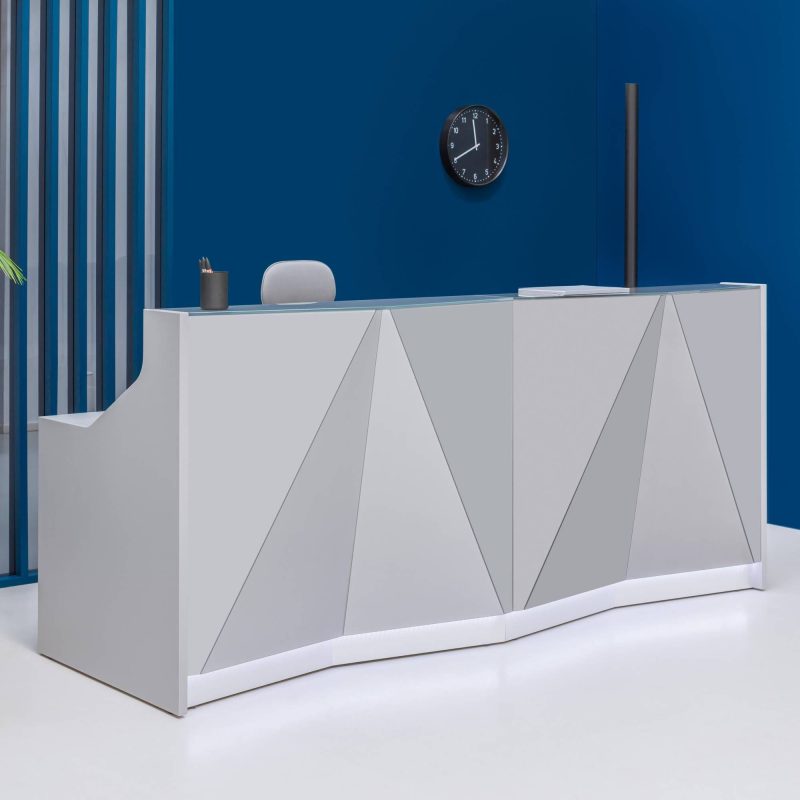 Key features include full-length LED lighting that subtly draws attention to the desk, and a glass 3D front that adds a refined, representative touch. The design includes a lower element option to support wheelchair users, promoting inclusive, accessible communication at the point of welcome.