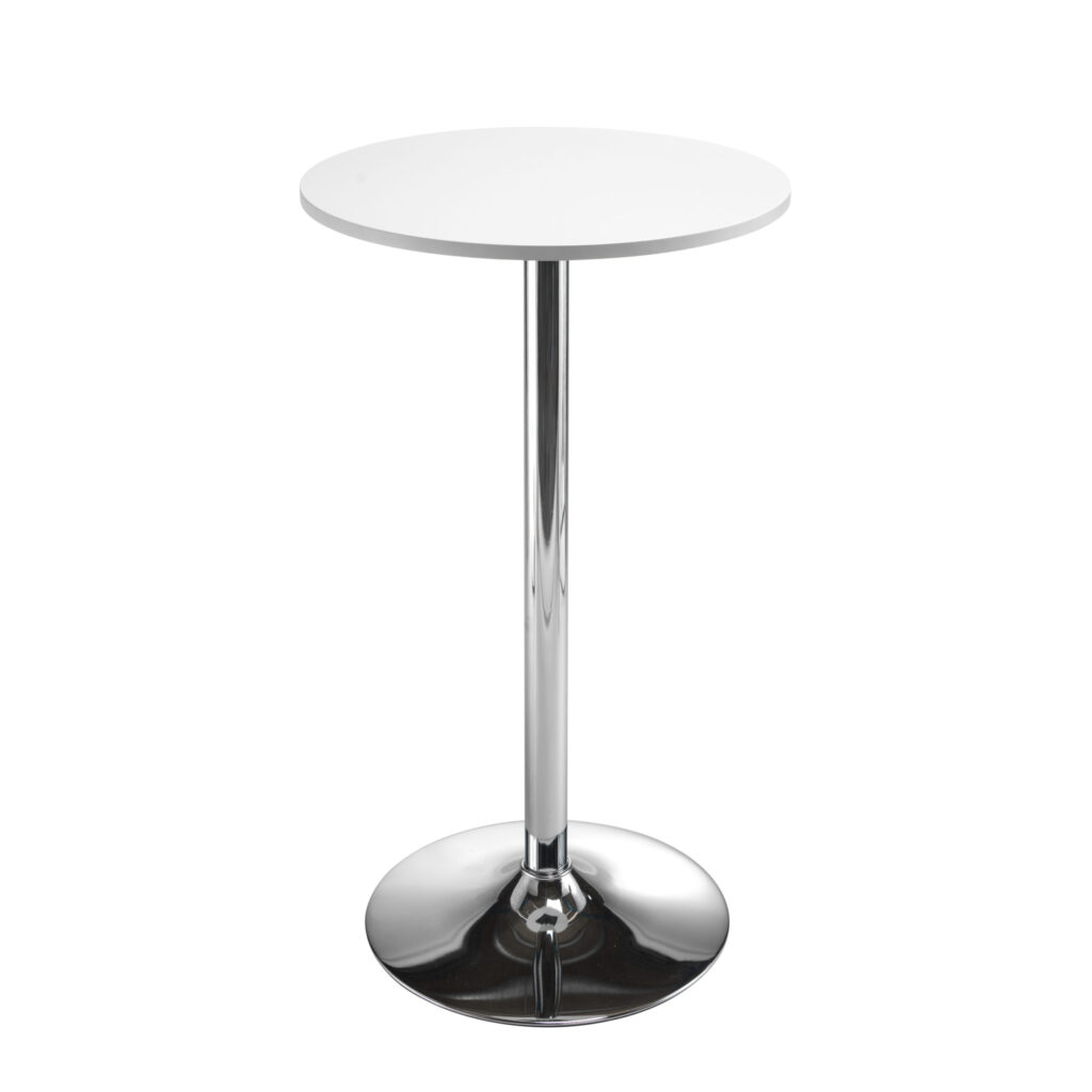 Its heavy flared base provides rock-solid stability, while the wood veneer top offers a smart, durable surface that’s easy to wipe clean. The chrome trumpet base adds a refined touch of elegance, ensuring the table remains a stylish part of your space even in commercial settings. The chrome trumpet base provides a clean, contemporary aesthetic that complements commercial interiors.