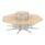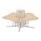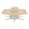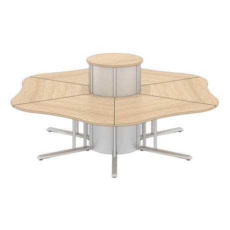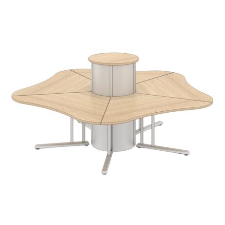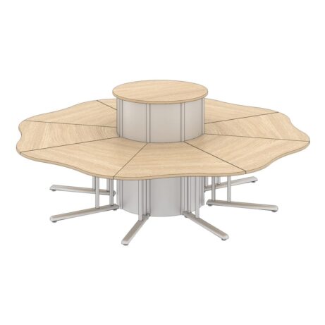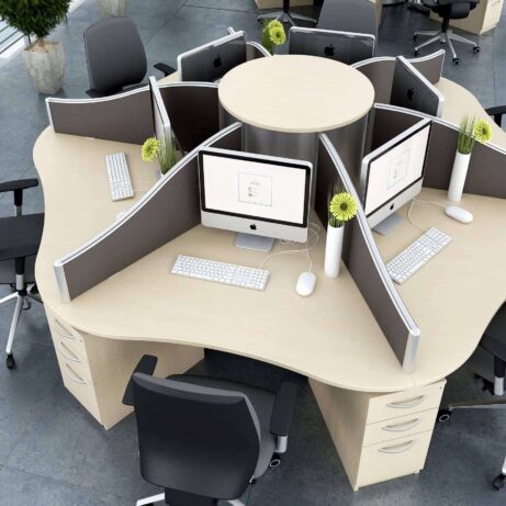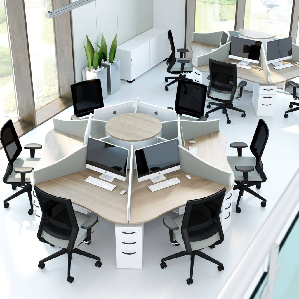 Six configurations are available to seat 3–8 users, with circular and semi-circular footprints that can be arranged in clusters to improve communication while maintaining individual space. Pedestals can sit over the horizontal leg frames, and privacy is easily provided with screen panels finished in MFC or fabric as required. A wide range of accessories — including CPU holders and desktop electrics — completes the setup for a ready-to-use workspace.