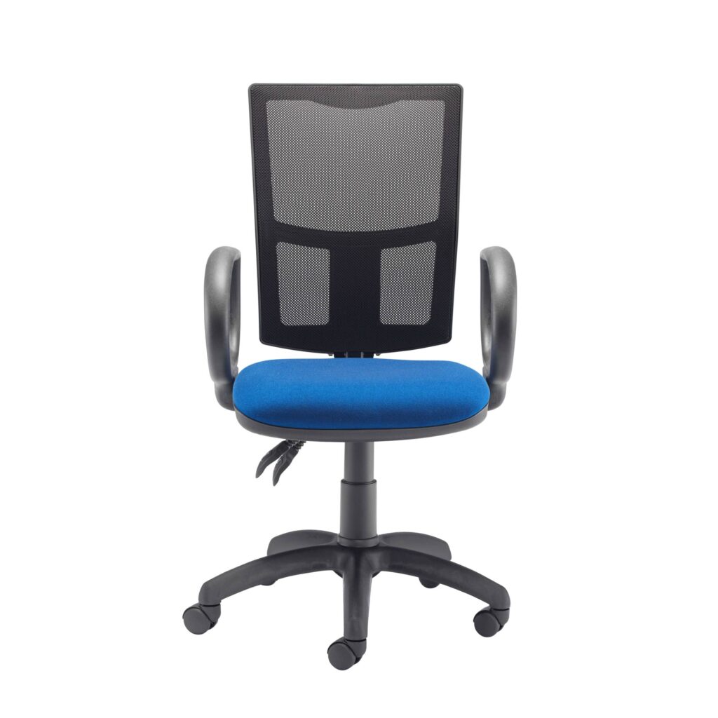 Breathable mesh, fixed arms and effortless adjustability make the Calypso 2 a reliable choice for everyday work. It features a permanent contact back mechanism for easy height and tilt adjustments, a high back for neck and shoulder support, and a durable five-star base with casters for smooth mobility. The seat is upholstered in 100% man-made fabric and is easy to clean. Dimensions: 640 mm W x 640 mm D; seat height 1010–1175 mm. For guidance on the right seating, contact us for assistance.