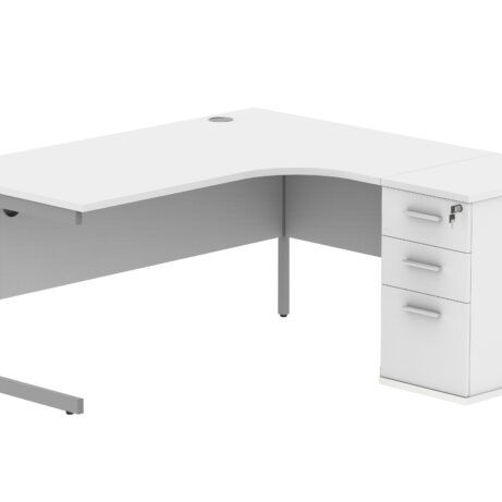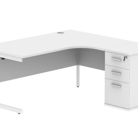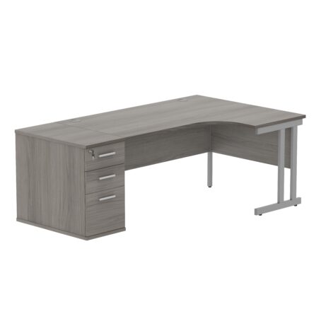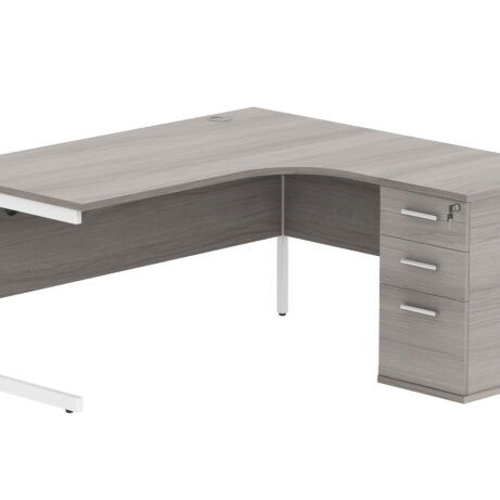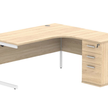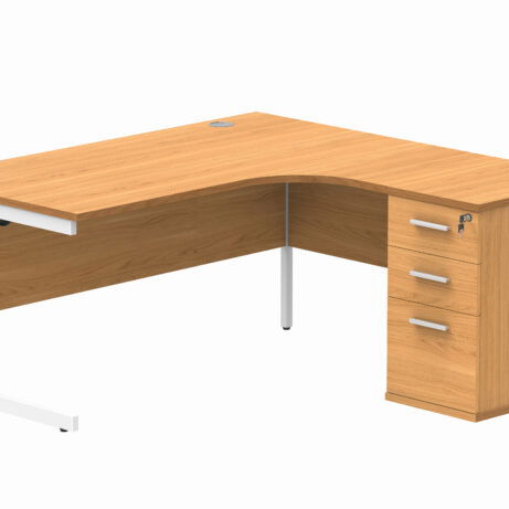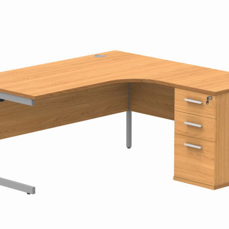 Robust, FSC-certified desk with built-in storage featuring a steel double upright frame and a right-hand radial work surface. The desk high pedestal provides essential storage, while adjustable feet ensure stability on uneven floors. With a wooden top finish and wooden back panel, this desk combines durability with a professional look. Dimensions: 1600mm W x 1200mm D x 730mm H.