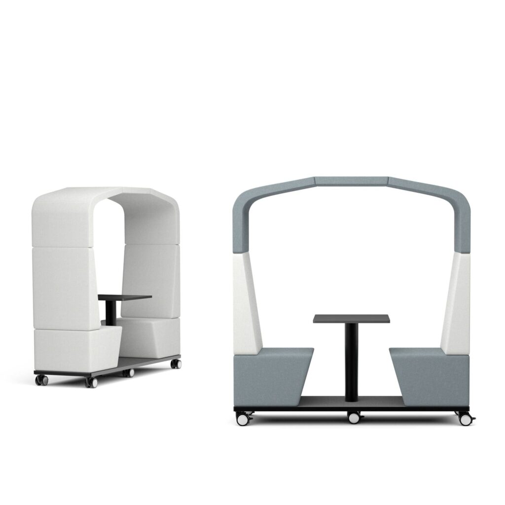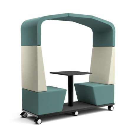 FIFTEEN Cabana is a mobile, two-seat hut with a built-in table and lockable castors, ideal for flexible office lounges and hospitality spaces. It measures 2020mm wide by 700mm deep and 2090mm high, with a 440mm seat height and a black base on four castors. Optional two-tone upholstery (+10%) and four table-top finishes let you tailor the look. Lead time: 4 weeks.