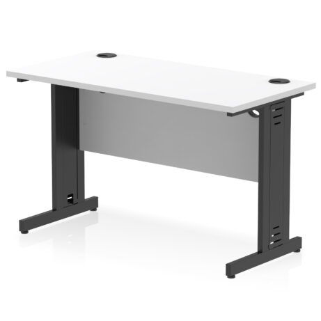 Impulse 1200mm Slimline Desk with Cable Managed Leg offers a compact, tidy workspace with built-in cable management. Its 25mm top with a heat-resistant melamine finish, plus an 18mm modesty panel and 2mm ABS edging, creates a durable, practical desk. Features include two cable ports, height-adjustable feet, steel-to-steel fixings and a 135Kg weight capacity, plus a deep-set modesty panel to suit most screen clamps.