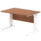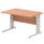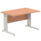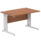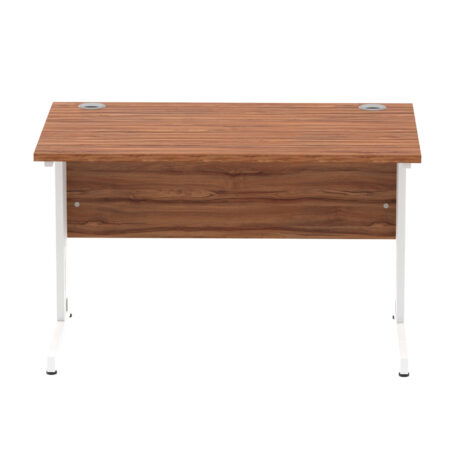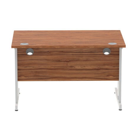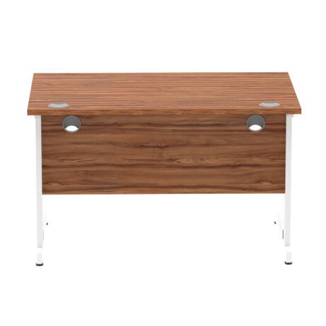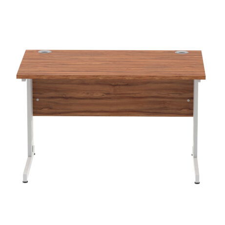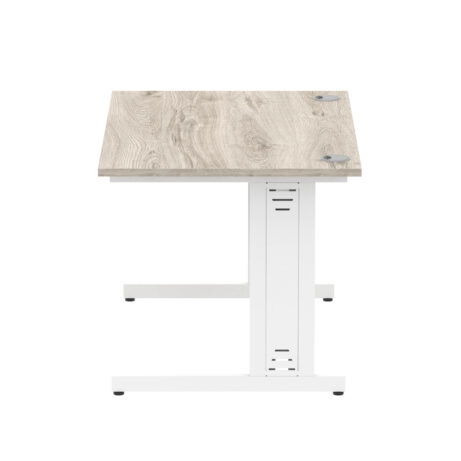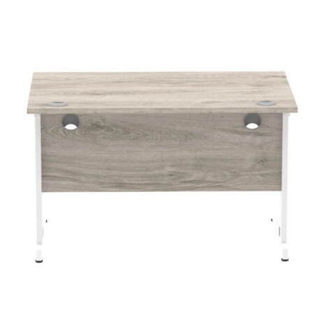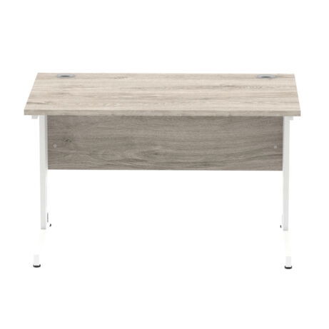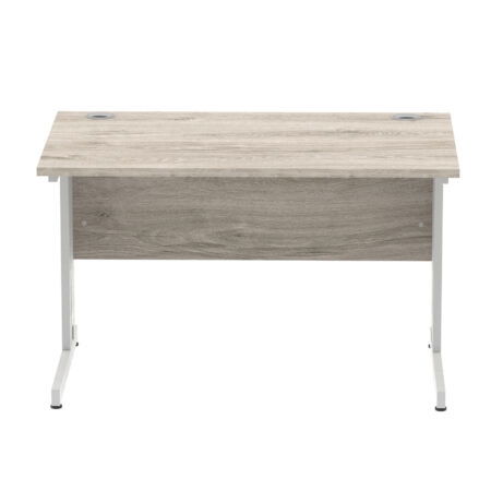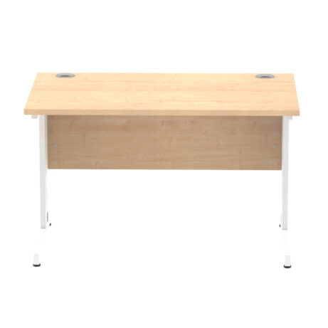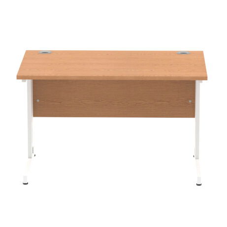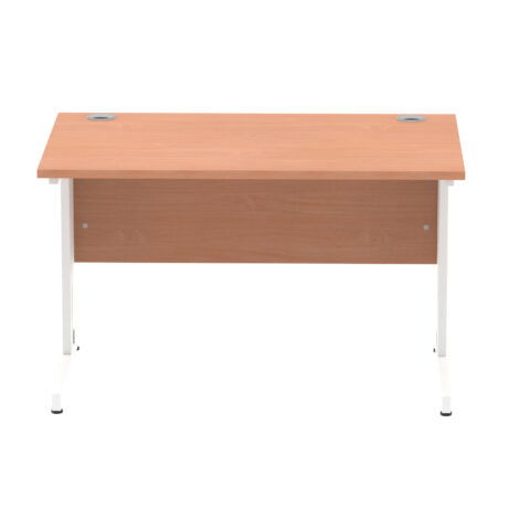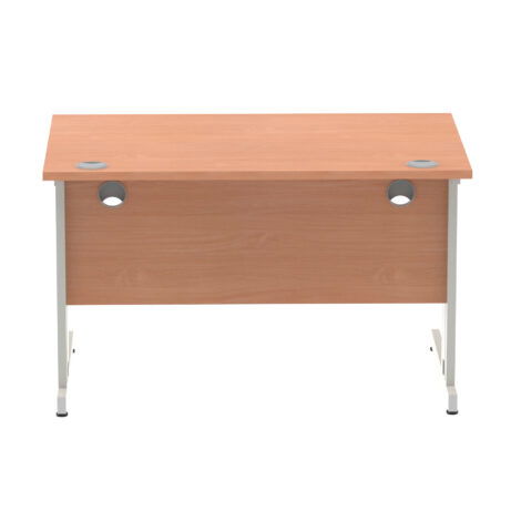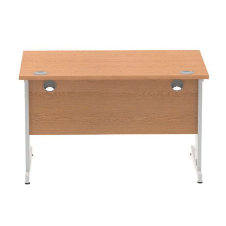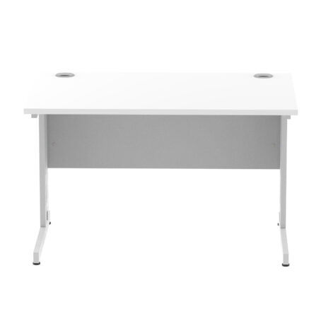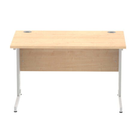 Ideal for teams and workstations, this 1200mm desk features a 25mm desktop with a heat resistant melamine finish that stands up to daily use. A dedicated wire management panel and two cable ports keep power and data cables neatly routed out of sight, reducing desk clutter and trip hazards. The 18mm modesty panel and 2mm ABS edging give a durable edge while maintaining a sleek look. The silver-coated double strut legs provide sturdy support, with height adjustable feet to ensure a level workspace on uneven floors.