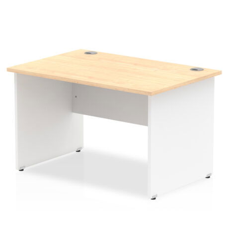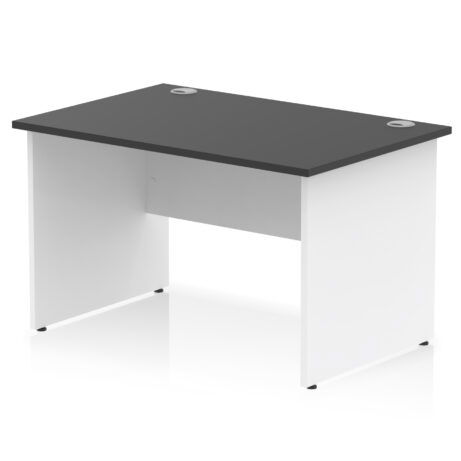 Impulse 1200mm Straight Desk Panel End Leg delivers exceptional value for contract offices with a sturdy 25mm worktop, heat-resistant melamine finish and matching wood-panel end legs. It includes two cable ports, height-adjustable feet and a robust 135 kg weight capacity to handle everyday workloads. The deep-set 5″ modesty panel and two slots support screen clamp fittings, while the two cable ports keep cables tidy. Perfect for Desking in modern workspaces and suitable for Individual Desks & Workstations.