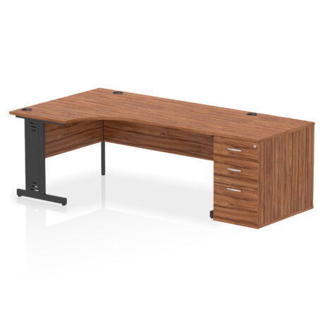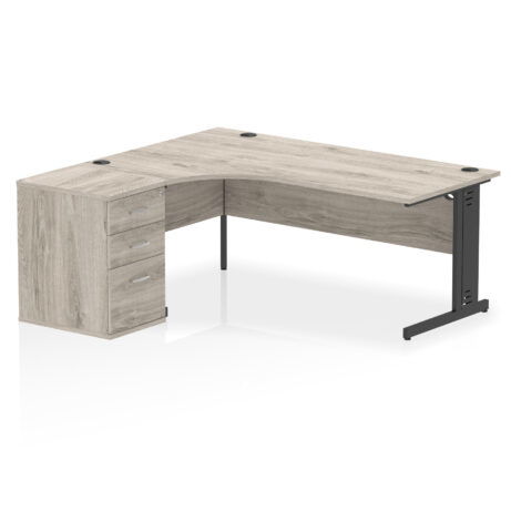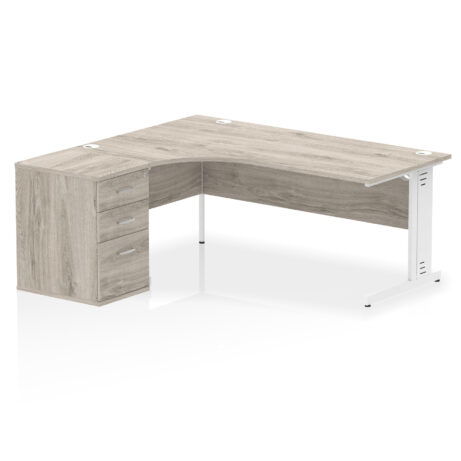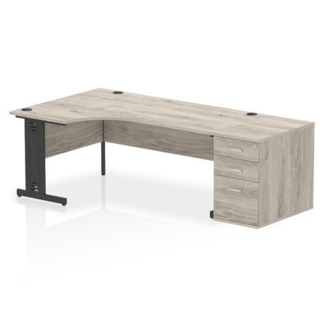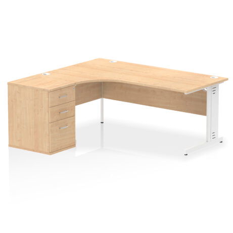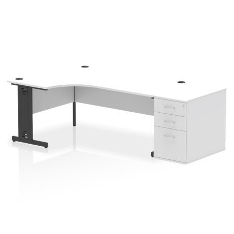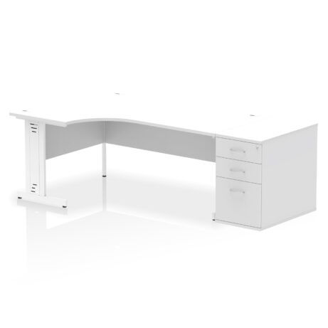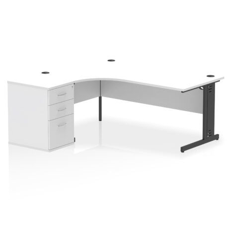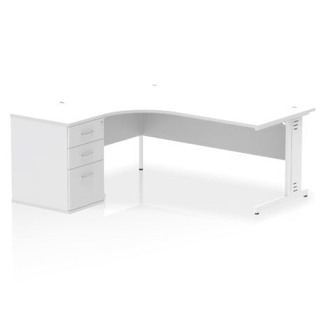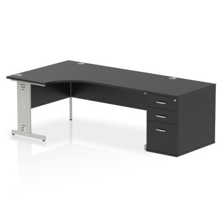 Impulse 1800mm Left Crescent Desk Workstation offers a wide, practical work surface (2084 mm wide x 870 mm deep) with an integrated lockable 3-drawer pedestal and tidy cable management. Features include a 25 mm top, heat-resistant melamine finish, 2 mm ABS edging, a deep 5″ modesty panel for screen clamps, and multiple cable ports. Ideal for office desking environments and Individual Desks & Workstations layouts.