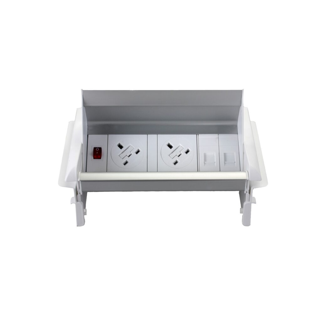 Two UK sockets with individual fusing (5A or 3.15A) and a neon switch provide safe, visible power at the desk. A 500mm lead to a 3-pole connector keeps desk power tidy and easy to connect.