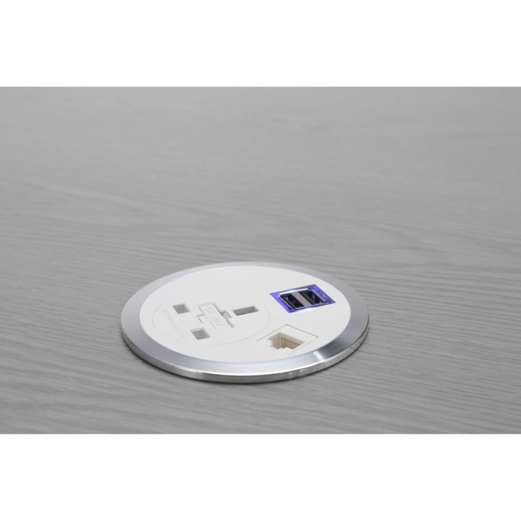 Impulse Port-EL 1 x UK Socket delivers safe, accessible power at the desk with an individually fused 5A outlet and a chrome bezel. It fits into an 80mm port hole for tidy, quick-to-install power access, ideal for Desk Accessories and Electrical Accessories setups.
