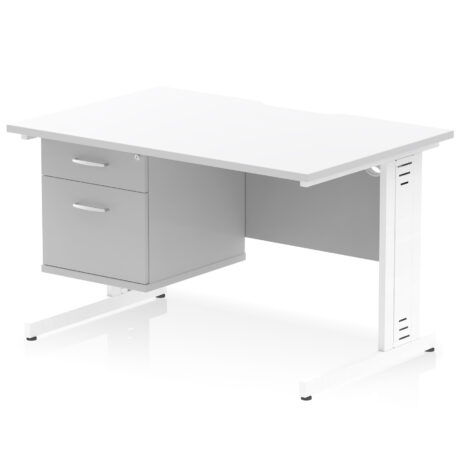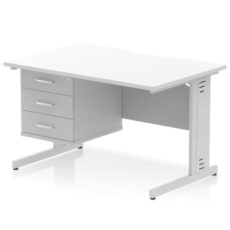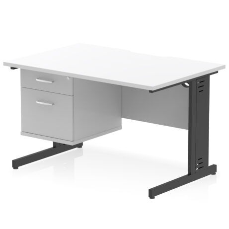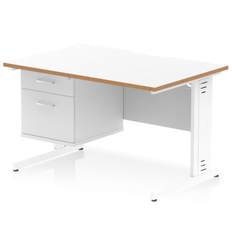 Efficient, cable-smart desking with a 25mm heat-resistant top, scalloped edge and integrated cable management. The single fixed pedestal provides two drawers for essentials, while coated double-strut legs and a 135 kg weight capacity ensure sturdy daily use. Ideal for busy Desking environments and Individual Desks & Workstations in modern workspaces.