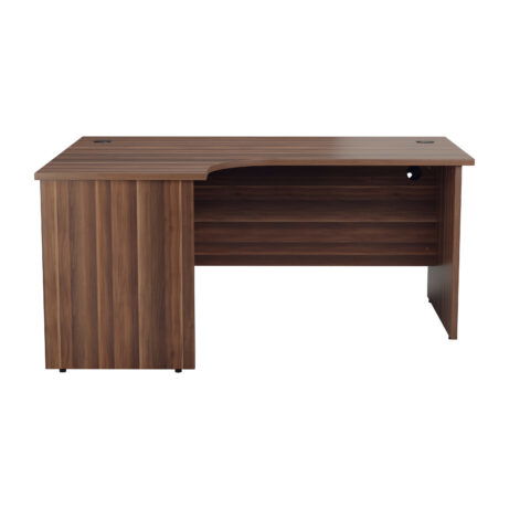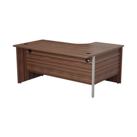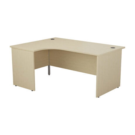 Maximise space and organisation with the Panel Left Hand Radial Desk. A durable left-hand radial desk with a matching wood finish top and legs, integrated grey cable ports for tidy wiring, and robust metal-to-metal fixings. It includes adjustable feet for levelling on uneven floors and a heat- and stain-resistant surface. Dimensions: 1800 x 1200 x 730-730 mm. Available in a variety of finishes.