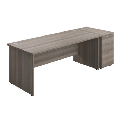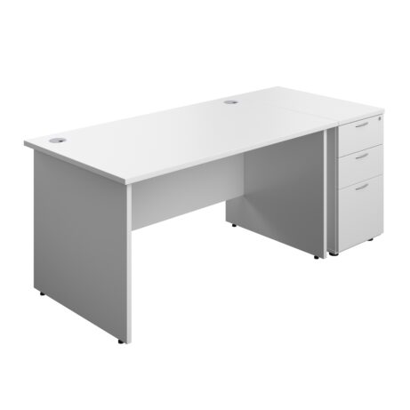 Efficient, all-in-one desk bundle combining a Panel Rectangular Desk with a 3-drawer high pedestal for tidy, productive workspaces. Features include integrated cable ports for cable management, durable metal fixings, adjustable feet for level setup, and a heat and stain resistant surface. Dimensions are 2004 x 800 x 730-730 mm, with multiple finishes available. Perfect for modern Desking solutions and Individual Desks & Workstations.