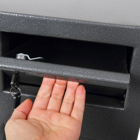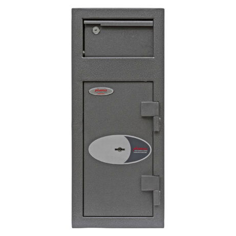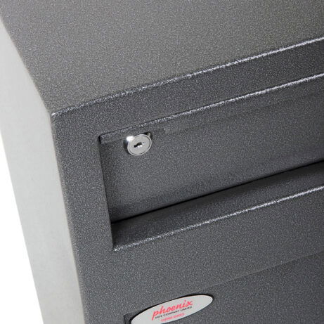 SECURITY PROTECTION – Recommended for overnight cash cover of £1,000 cash or £10,000 valuables | LOCKING – Fitted with a high security double bitted lock supplied with two keys | DEPOSIT FACILITY – Fitted with a lockable deposit (2 keys supplied) with Phoenix tilting baffle plate to ensure that the contents cannot be ‘fished out’ | CONSTRUCTION – Constructed of 6mm steel plate door and 2mm body | FIXING – Ready prepared for floor and wall fixing with bolts supplied | COLOUR – Finished in a high quality scratch resistant Metallic Graphite paint.