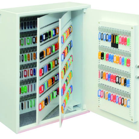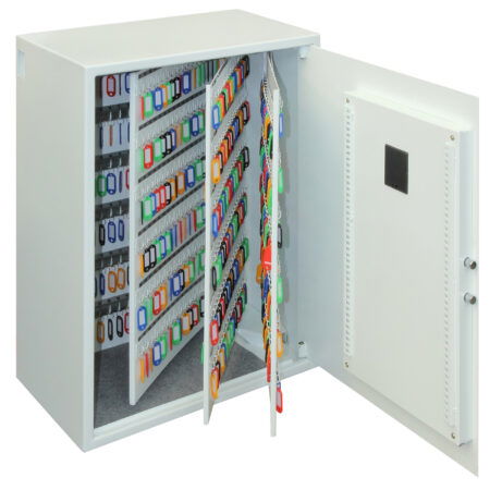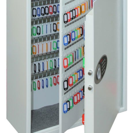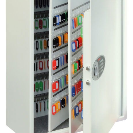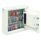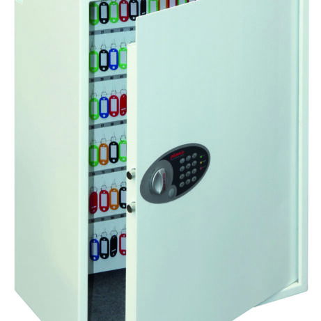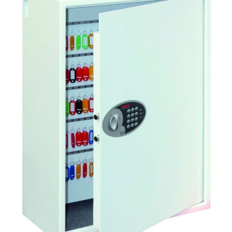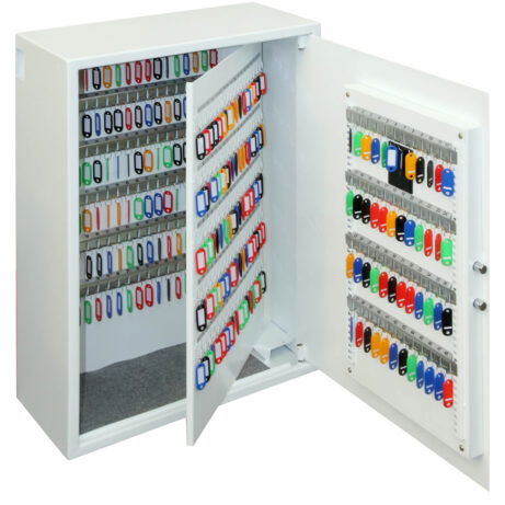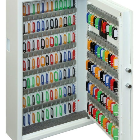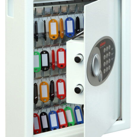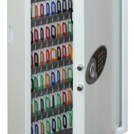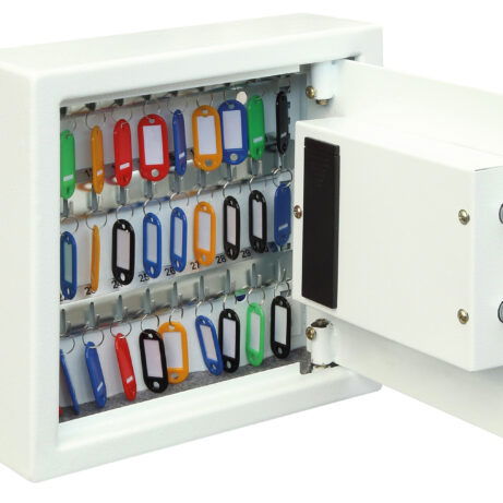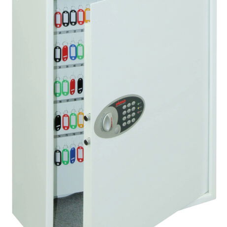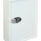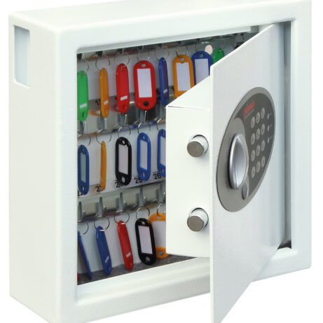 Fixing is straightforward: the unit is ready prepared for wall-mounting with bolts supplied. Special features include a deposit slot (55H x 35W x 15D mm) and a set of key tags with coloured rings. The finish is a high-quality scratch-resistant paint in RAL 9003 White.