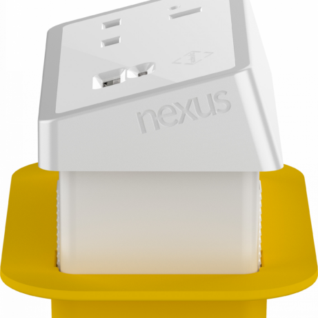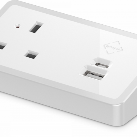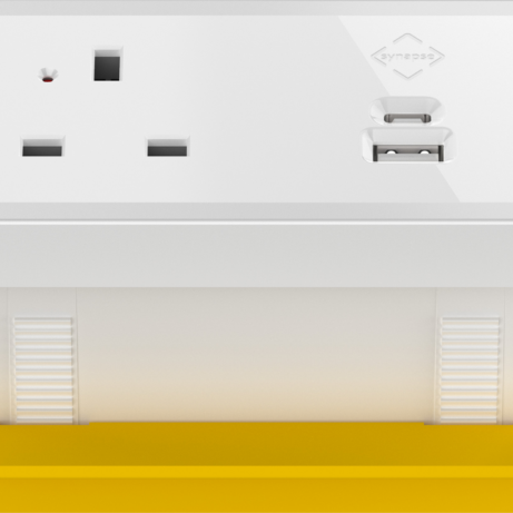 In-desk power module with a 3 metre mains cable bundle, housed in aluminium with veneer options in white, silver or black. Features single or double 240V sockets, plus standard USB-C (30W) and USB-A (27W) ports; optional USB-C up to 100W via Synapse smart functionality (hub required). Includes a 0.5 metre lead with GST connector for tidy desk wiring.