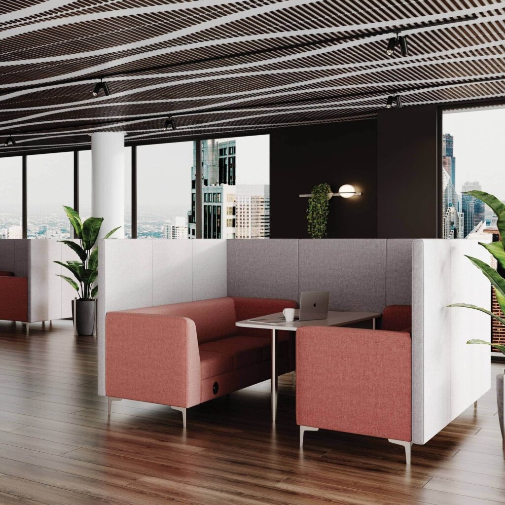 Four-seat, self-contained collaboration booth with a built-in table and tidy cable management. Optional USB & power sockets, plus 7 table top finishes and chrome, black or white feet. Ideal for quick meetings or focused team sessions in busy offices. Lead time 3–4 weeks.