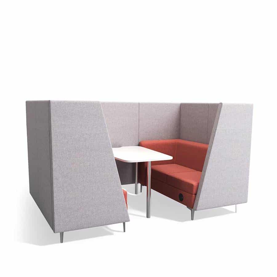 SIMOOM 4-seat, self-contained collaboration booth with a built-in table and tidy cable management. Optional USB & power sockets, plus 6 table top finishes and chrome, black or white feet. Ideal for quick meetings or focused team sessions in busy offices. Lead time 3–4 weeks.