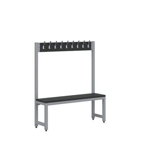 Durable, single-sided cloakroom bench with nine hooks for efficient organisation in busy changing rooms. The powder-coated steel frame withstands years of daily use, and adjustable levelling feet keep it stable on uneven floors. Dimensions: 1200 mm wide x 300 mm deep x 1370 mm high.