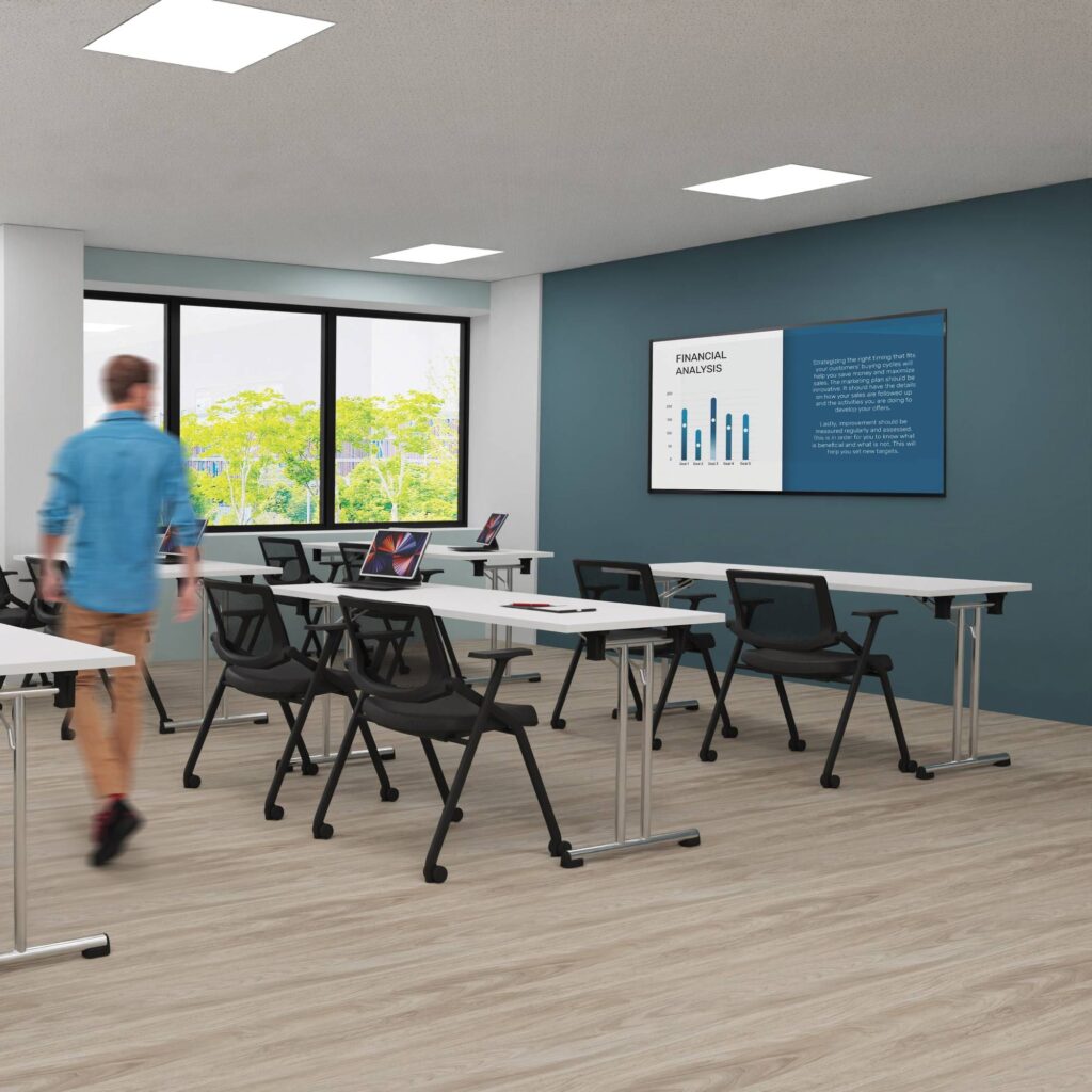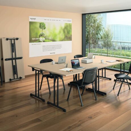 Solution Folding Tables are adaptable, space-saving surfaces designed for multipurpose spaces such as meeting rooms, training rooms, and flexible work zones. They let you create single or multiple layouts quickly, so you can reconfigure spaces to suit a workshop, presentation, or collaborative session without sacrificing stability or durability. The 25 mm Structurex® melamine-coated tops offer a robust, easy-to-clean writing surface, finished with 2 mm shock-proof ABS edging and right-angled corners for a tidy, professional look. With a generous 70 cm depth, they help optimise room flow while keeping chairs and participants comfortably accommodated.