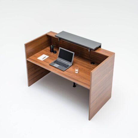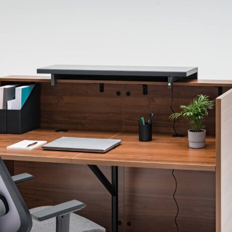 Why choose Tera? Its modular design enables straight and corner configurations to suit your floor plan and workflow. The system can be assembled with a low module and overhang worktop to facilitate communication with visitors, including those using wheelchairs. Available modules and accessories support a range of layouts and storage solutions, keeping desks organised and accessible.