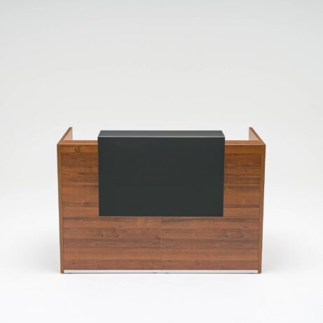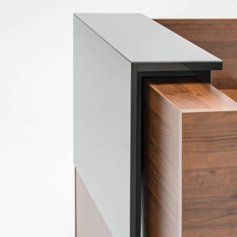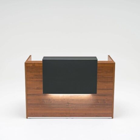 Enhance presence with the optional TR99 top element finished with glass and HPL, complemented by a full-length LED light along the top to draw attention as guests approach the reception. Accessories such as M071 mediabox, PK81 grommet, S69 and E64 cable trays, and SPD01 suspension drawer expand practicality while keeping cables tidy.
