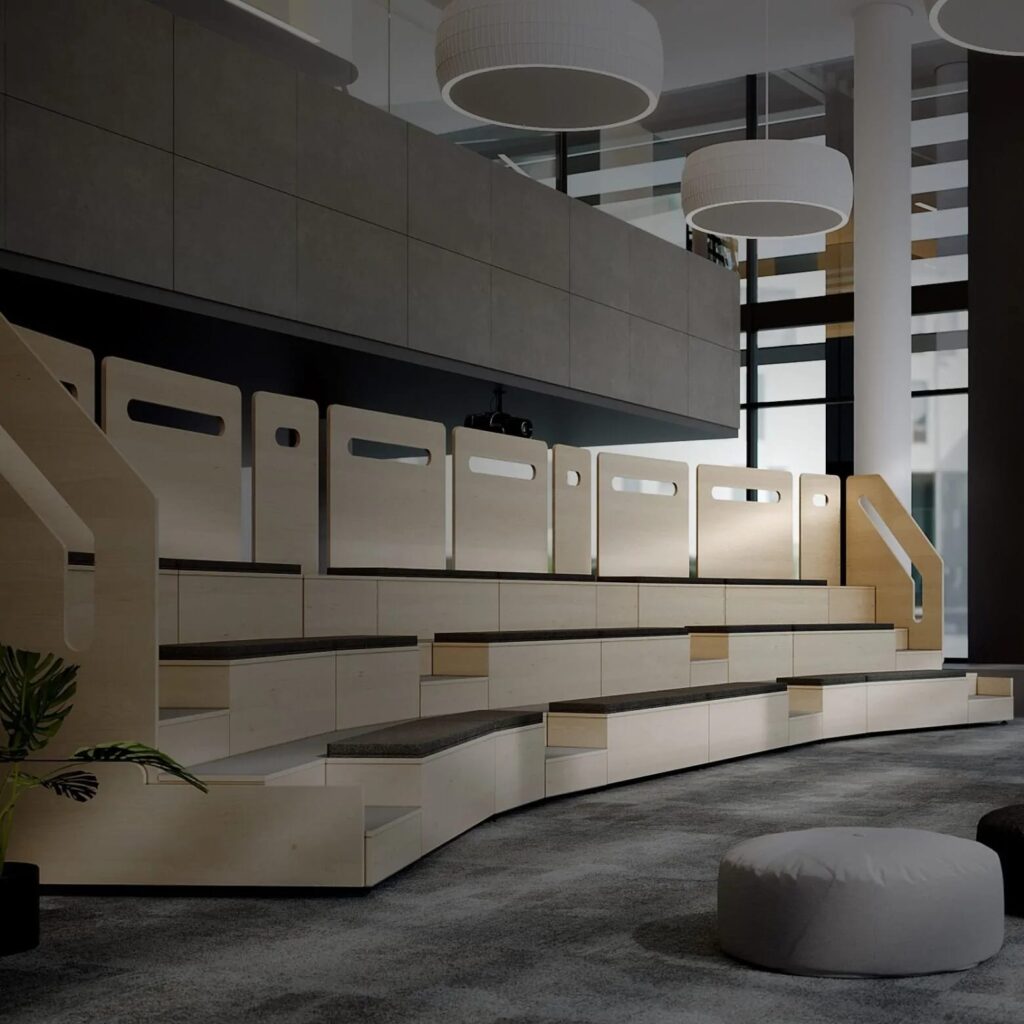 TIER is a scalable three-tier auditorium seating system that configures into 12, 16, 20 or 24-seat layouts from eight modular units. The design promotes focus with semi-private balustrades and forward-facing sightlines, while robust poplar veneer plywood delivers durability. With on-site assembly, standard interfaces, and compliance with building regulations, it’s a practical solution for adaptable training and conference spaces. Contact us for assistance or more information.