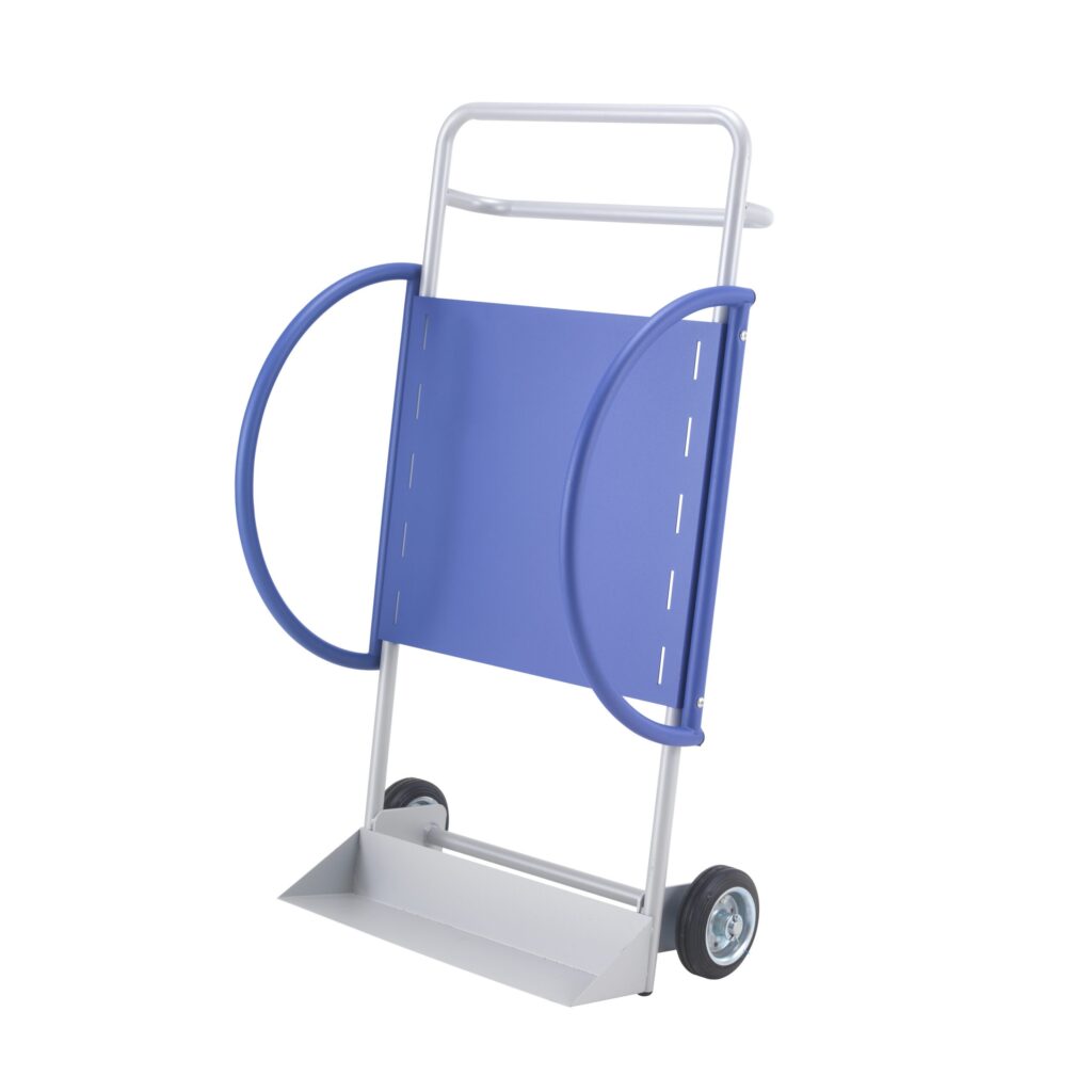 Move up to 15 Titan folding chairs in one go with the Titan Chair Trolley. Built for busy environments—assemblies, events and exam halls—it combines a solid silver painted frame with blue supports, large bar handles and thick tyres for easier movement. Dimensions: 630x507x1158-1158.
