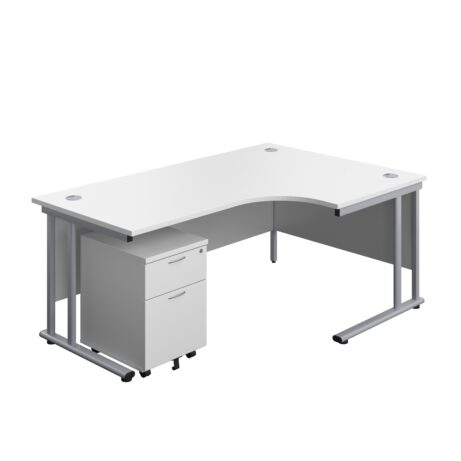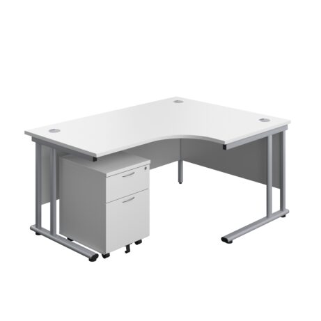 Space-saving right-hand radial desk with a mobile 2-drawer pedestal provides tidy cable management and flexible storage for busy environments. With a 1600 x 1200 mm work surface and a durable powder-coated frame in white, silver or black, it fits neatly into office desking spaces and complements pieces from the Individual Desks & Workstations range. FSC-certified for responsible sourcing, this desk offers longevity and value for money.