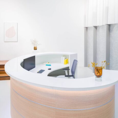 Modular, accessible reception desks designed for flexible layouts, with straight, corner, or curved configurations and full-length LED lighting. Valde adapts to space and accessibility needs, offering a monitor shelf and storage options for tidy operation. Suitable for Reception Desks within the Reception category.