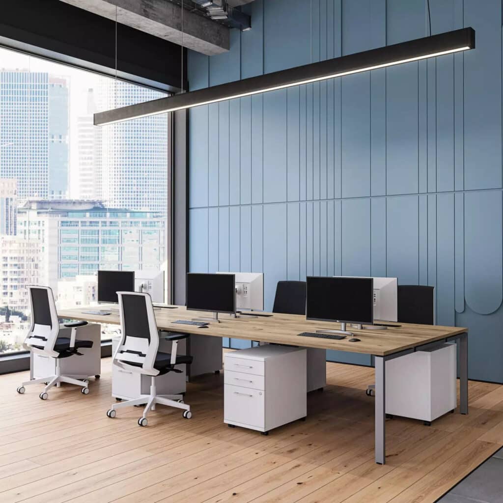 Veta Bench is a goal post leg bench system renowned for its sturdy, long-lasting construction, setting it apart from many alternatives on the market. Available in Silver, Black, or White trim, with a choice of 700mm or 800mm deep desktops, it offers exceptional versatility at a competitive price point. Thoughtful standard features, such as cable trays and a range of desktop screens, elevate both its practicality and visual appeal.