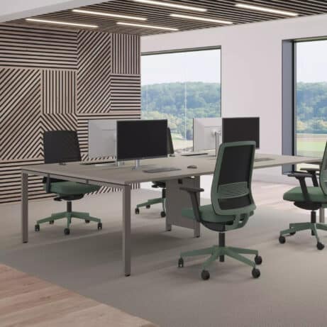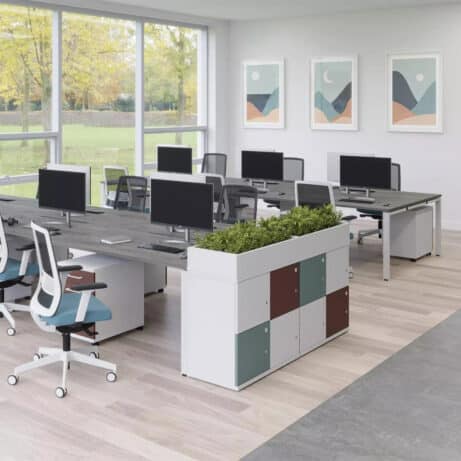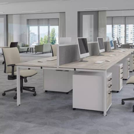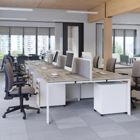 Veta Bench is a goal post leg bench system renowned for its sturdy, long-lasting construction, setting it apart from many alternatives on the market. Available in Silver, Black, or White trim, with a choice of 700mm or 800mm deep desktops, it offers exceptional versatility at a competitive price point. Thoughtful standard features, such as cable trays and a range of desktop screens, elevate both its practicality and visual appeal.